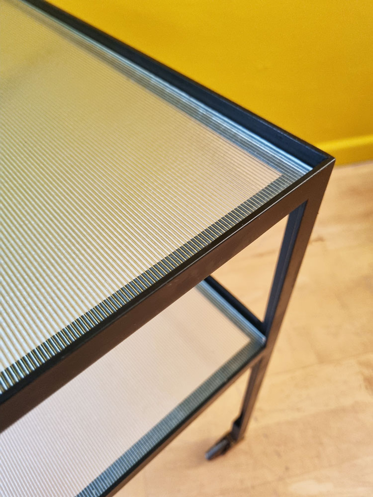 Structure en acier laqué noir surmontée de deux plaques de verre ondulé