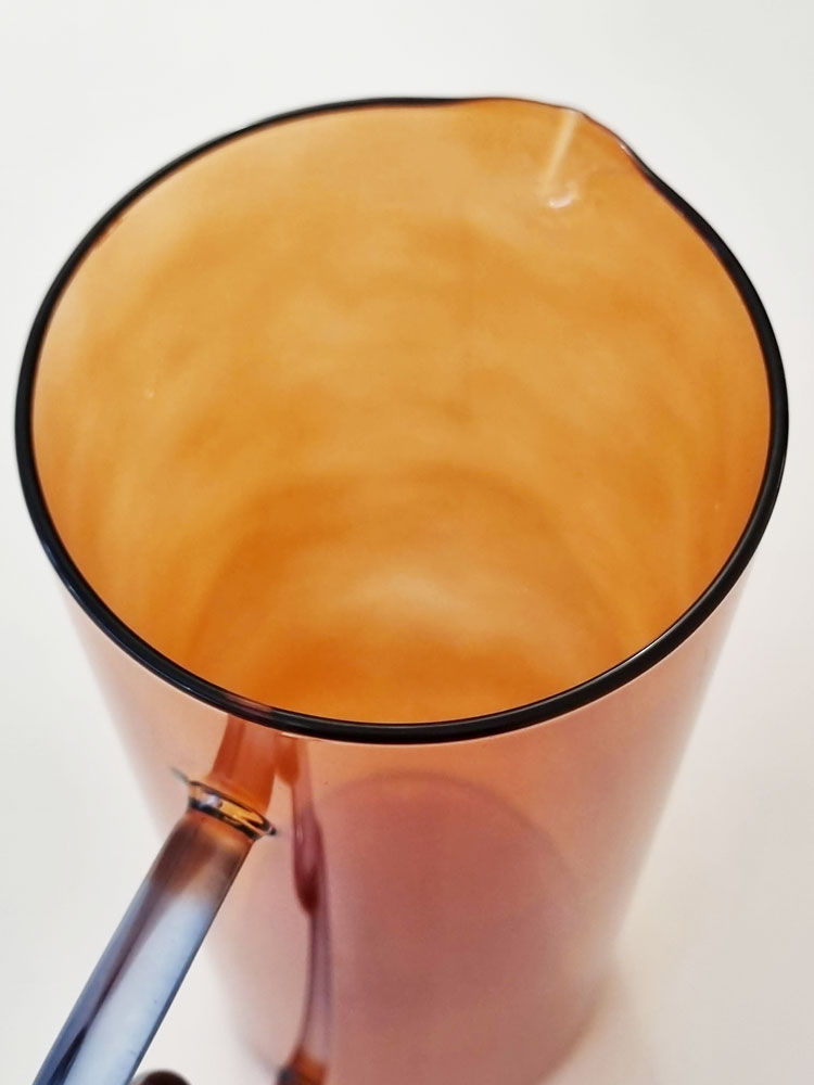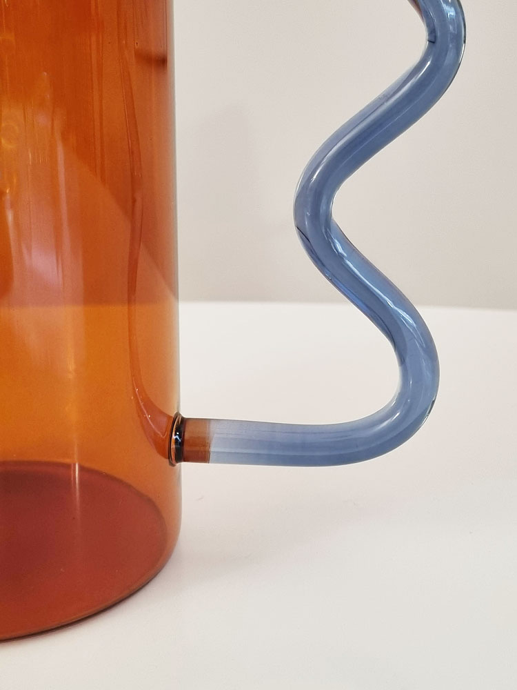 Pichet à eau en verre borosilicate de couleur ambre orangé avec anse bleu ciel