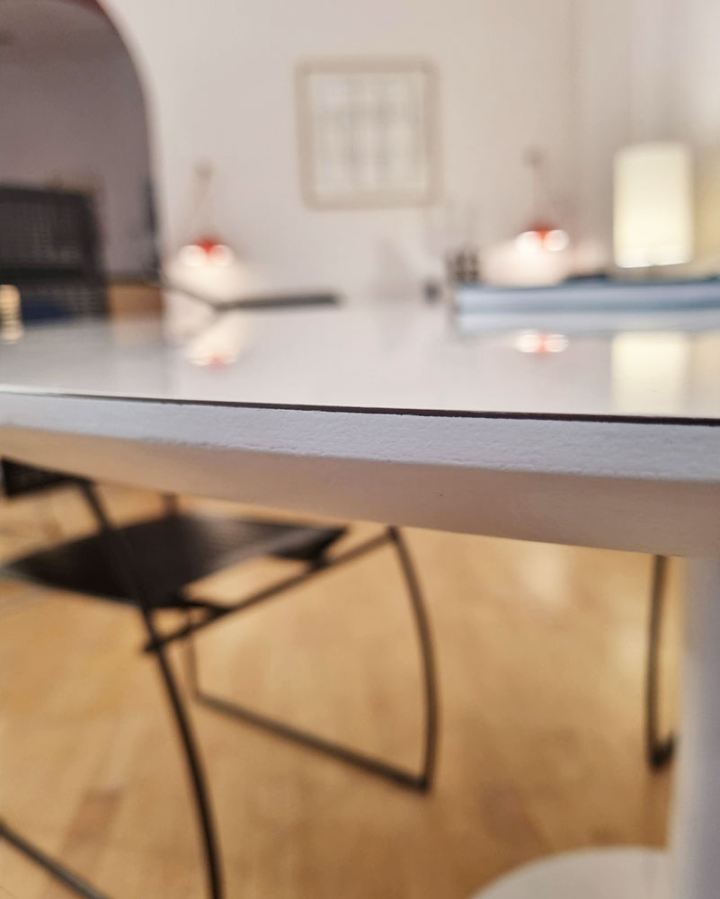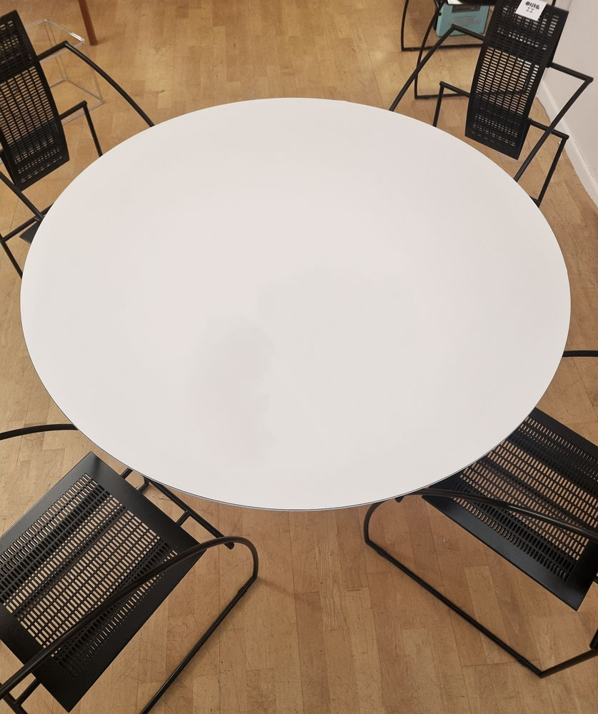 Elégante table ronde en bois recouvert de mélamine blanche pour 4 à 6 convives, avec pied tulipe en aluminium laqué blanc